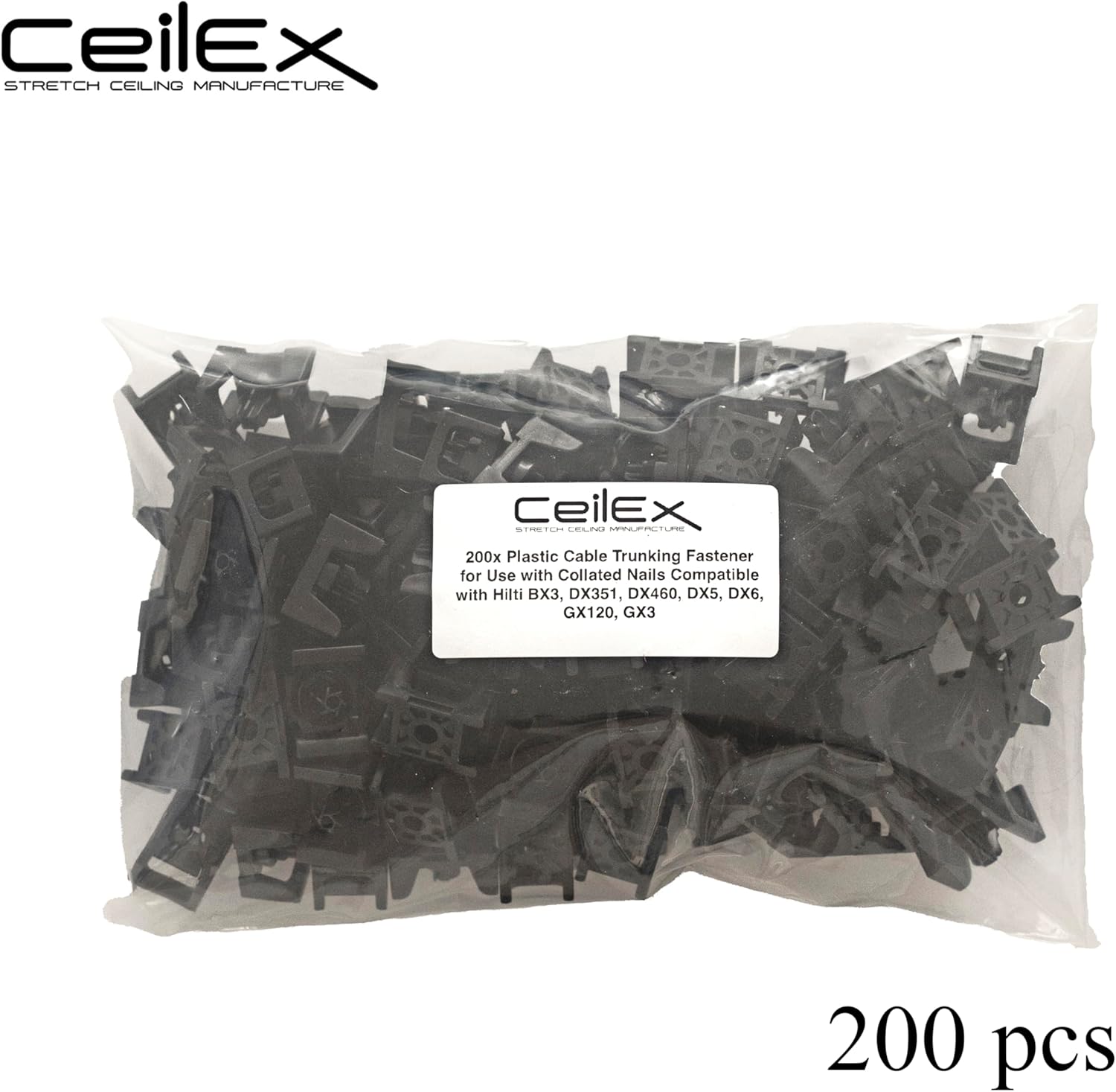 Premium quality collated concrete nails for the Hilti BX3 cordless nailer Base materials: Concrete (soft & hard), Masonry (concrete block with grout), Masonry (lime sand brick), Concrete (lightweight for placement on metal plate), steel, etc... Minimum thickness of base material (concrete): 60 mm Corrosion protection: galvanized coating 8μm made of ultra hard carbon steel (53-58HRC) 1000 pcs per box, 10 pcs nails on strip, length 5/8'' (16mm), 3/4'' (19mm), 7/8'' (22mm), 1'' (25mm), 1 1/16'' (27mm), 1 1/4'' (32mm) or 1 1/2'' (38mm), thickness 3mm For use with tools: Fully compatible with all Hilti BX3 nail guns (BX 3 02, BX 3-IF, BX 3-L 02, BX 3-ME, BX 3-ME (02)) 200 pcs Plastic Cable Trunking Fastener for Use with Collated Nails Compatible with Hilti BX3, DX351, DX460, DX5, DX6, GX120, GX3