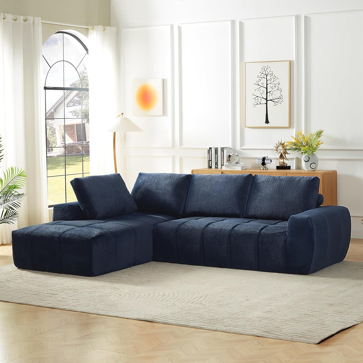 This 111.4" L-shaped sofa features a clean, contemporary silhouette that effortlessly elevates any living space. Its compact yet spacious structure maximizes seating area while maintaining a streamlined look, perfect for blending with various interior styles—from modern to Scandinavian. Crafted with high-quality chenille fabric, the 3-seat couch offers a soft, plush touch that enhances relaxation. The thick, supportive cushions and well-padded backrest provide optimal comfort for lounging, movie nights, or casual gatherings with family and friends. Designed for convenience, this sofa requires no complicated assembly—just unbox and use immediately. Its versatile size and style make it ideal for living rooms, apartments, or reception areas, balancing functionality and exquisite aesthetics seamlessly.