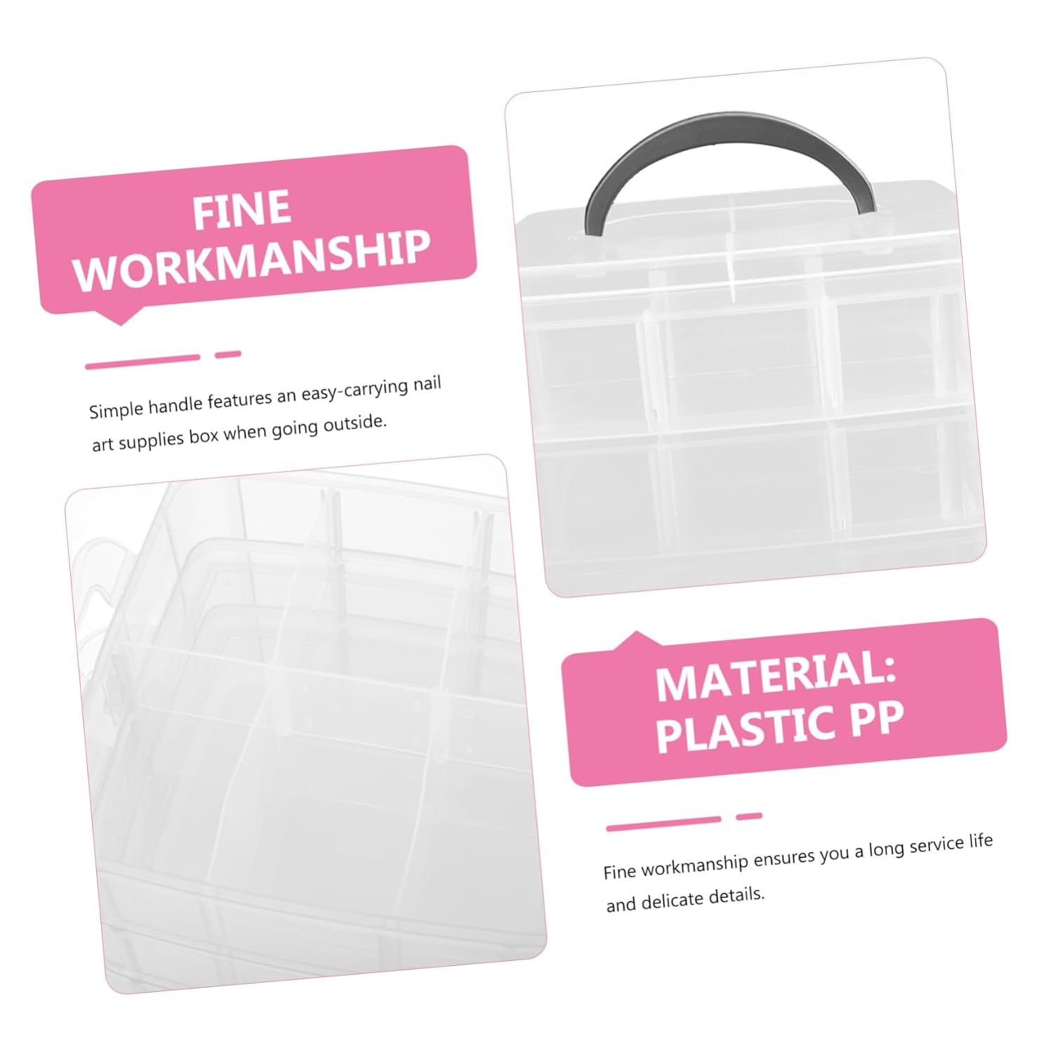 Package Include 2 x manicure tool storage boxes Characteristics - Material: Plastic PP Nail Art Supply -Reverse buckle handle, convenient to close and open Fashion style, simple design Manicure Tool Storage Box. -Comfortable handle, ergonomic design, arm soreness and fatigue Manicure Artist Tool Box. -Manufactured of PP plastic materials, , solid and sturdy Fingernail Art Toolbox. -Large capacity to store more, layered to meet the daily storage of nail art salon Manicure Tool Storage Container. -Scientific partition, detachable compartment Our storage box is easy to open and close storage bins for toys.Goods InformationPortable Toolbox Do you wanna a and sturdy nail art supplies tool storage box? If you want, you must not miss our product, which is very lightweight and easy to move.Stylish Nail Art Toolbox An beautician nail polish glue storage box. Fingernail Art Toolbox Made of PP material, very and .nail polish organizer case This box can be used to classify your nail art supplies very well