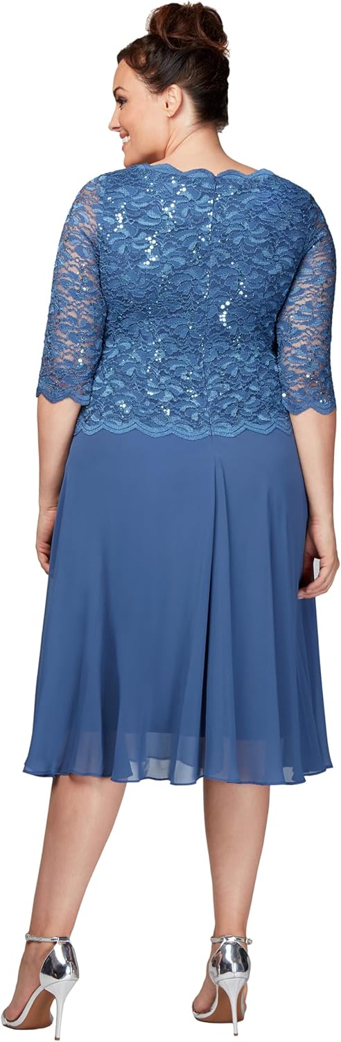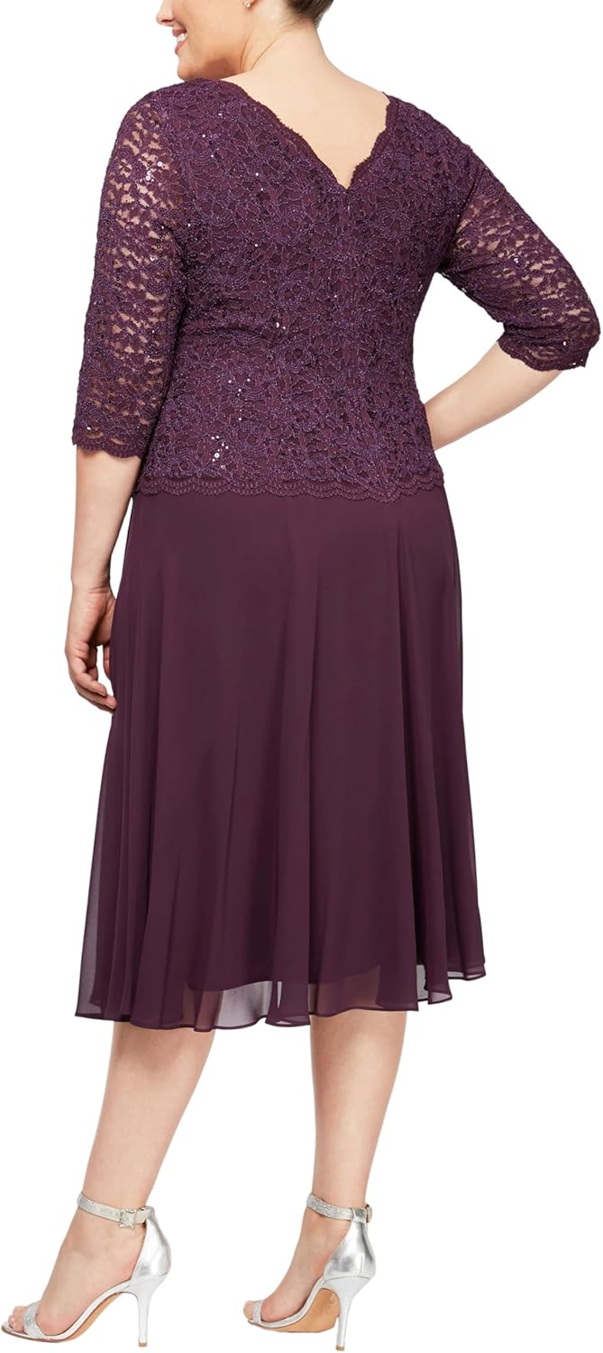 Our tea-length mock 2-piece cocktail dress is the picture of elegance with sheer lace sleeves, silky chiffon skirt & scalloped lace edges. Perfect for Mother-of-the-Brides (& Grooms)! Hand wash in cold water Lay flat to dry Items must be unworn, unwashed and undamaged, with all tags attached Final sale items cannot be returned Items sent back without authorization, or an Alex Evenings return label, may not be eligible for refunds