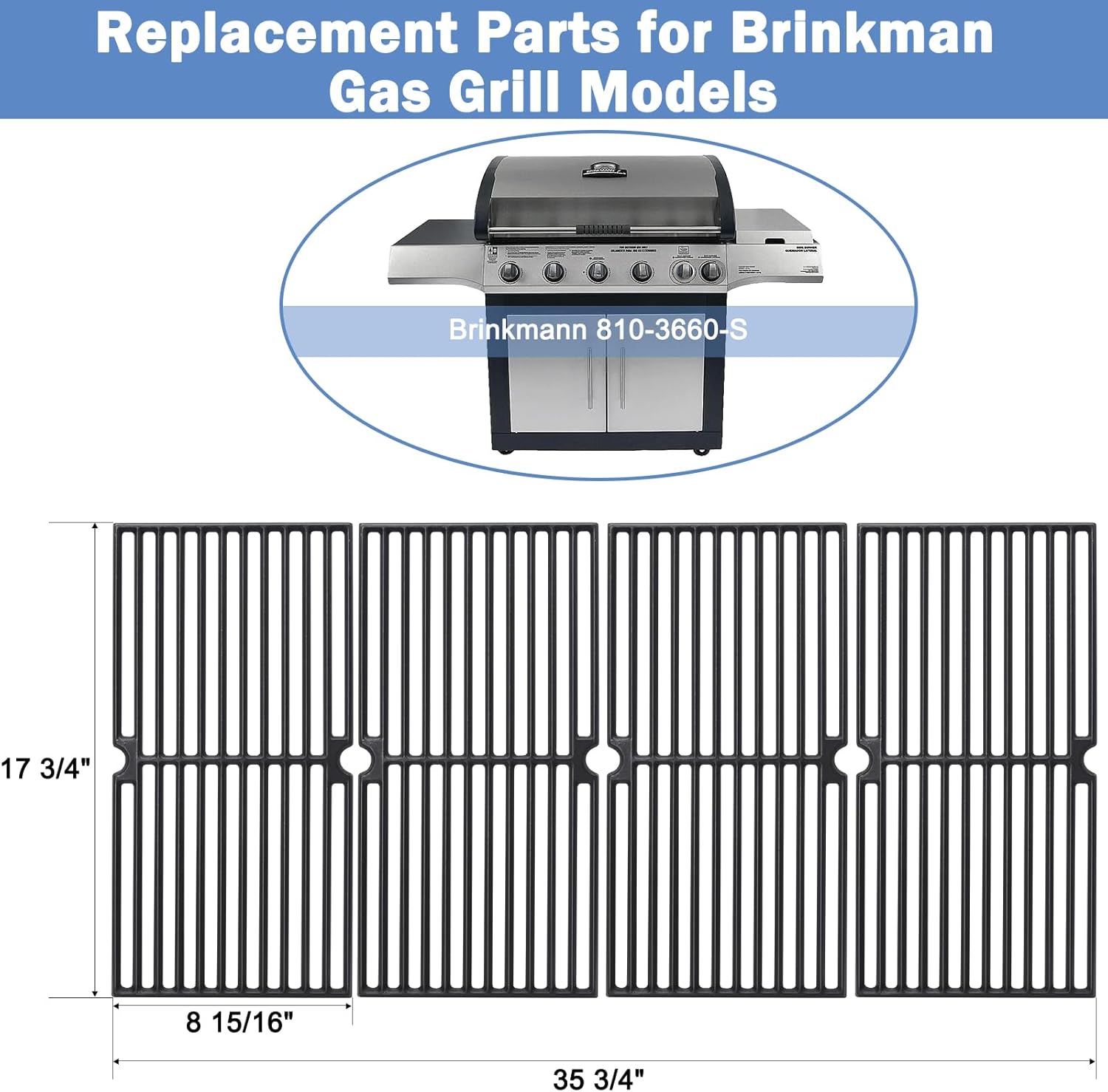 Criditpid Grill Replacement Parts kit for Brinkman 810-3660-S, 810-3661-F Models. Stainless Steel Grill Heat Plate Shields, Pipe Burner Tubes and Crossover Tubes.Specification ★ 4PCS Heat Plates : 15 3/8" x 3 15/16"; 1PCS Heat Plate : 15 5/16" x 6 1/4", Material: Porcelain Steel ★ Pipe Burner Tube: 15 5/16" x 1"; U Shape Burner: 15 3/8" x 4 3/8", Material: Stainless Steel ★ Crossover Tube: 7 5/8" x 2 5/16", Material: Stainless Steel ➤ The Brinkmann 810-3660-S grill replacement parts includes 5pcs heat plates, 5pcs grill burner tubes, 3pcs Carryover Tube.Compatibility Grill Replacement Parts Kit for Brinkmann/ Brinkman 810-3660-S, 810-3661-FAdvantage & Benefit: 👉Perfect fit, Work well 👉Very easy to install 👉Much cheaper than buying locally 👉Made your grill like new again 👉Extend the life of your old grill