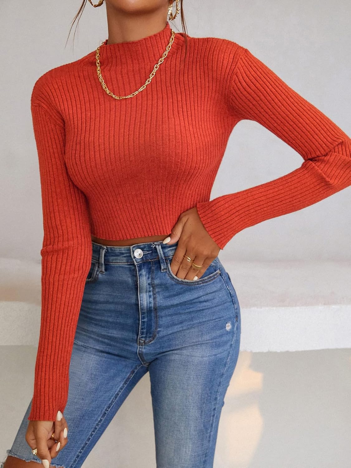 SBicep Length : 7.5 inchBust : 23.6 inchCuff : 6.3 inchLength : 15 inchShoulder : 12.6 inchSleeve Length : 23.2 inchMBicep Length : 8.1 inchBust : 25.2 inchCuff : 6.7 inchLength : 15.4 inchShoulder : 13 inchSleeve Length : 23.6 inchLBicep Length : 8.9 inchBust : 27.6 inchCuff : 7.3 inchLength : 15.9 inchShoulder : 13.6 inchSleeve Length : 24.2 inchColor: Black,Dark Grey,Apricot,White,Burnt Orange,Royal Blue,Rust Brown,Lime Green,GreenStyle: Basics,CasualPattern Type: PlainDetails: Rib-KnitType: Basic TopsNeckline: Stand CollarSleeve Length: Long SleeveSleeve Type: Regular SleeveLength: CropFit Type: Slim FitFabric: Slight StretchMaterial: AcrylicComposition: 50% Acrylic,30% Polyester,20% PolyamideCare Instructions: Machine wash or professional dry cleanSheer: No