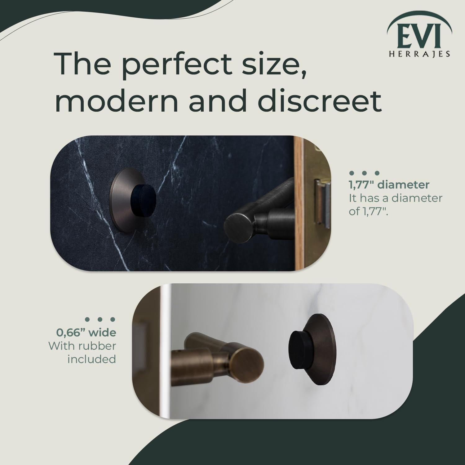 Protect your home and give it a touch of distinction with the EVI Wall Stop! This innovative protection system is designed to absorb impacts and prevent shocks, chips, marks and rubbing on your walls, furniture and radiators. Keep everything in good shape for longer! But it's not only about protection, the EVI Wall Stop also adds a modern, minimalist style to your decor. Made of brass or stainless steel, a noble and durable material, this door stop offers a touch of distinction to your home. In addition, we offer you two colors included in the package: black or white silicone. Choose the color that best suits your style! Installation couldn't be easier. We offer you two options: adhesive or ladder. Both are quick and simple ways to install, and ensure solid fixation. You decide how you want to do it! Don't waste more time and discover the comfort and guarantee offered by our DUAL EVI system. He relies on the quality of EVI, a European manufacturer with extensive experience in the decorative hardware and accessories sector. All our products are made in Spain with the best materials and finishes. We guarantee durability and satisfaction! Also, don't worry if you have any questions or queries. EVI offers excellent customer service, available through Amazon's internal messaging. Our team will be happy to solve any questions you have about the product or its installation. Protect, decorate and trust the EVI Wall Stopper. Click "Add to Cart" right now and give your home the protection and style it deserves!