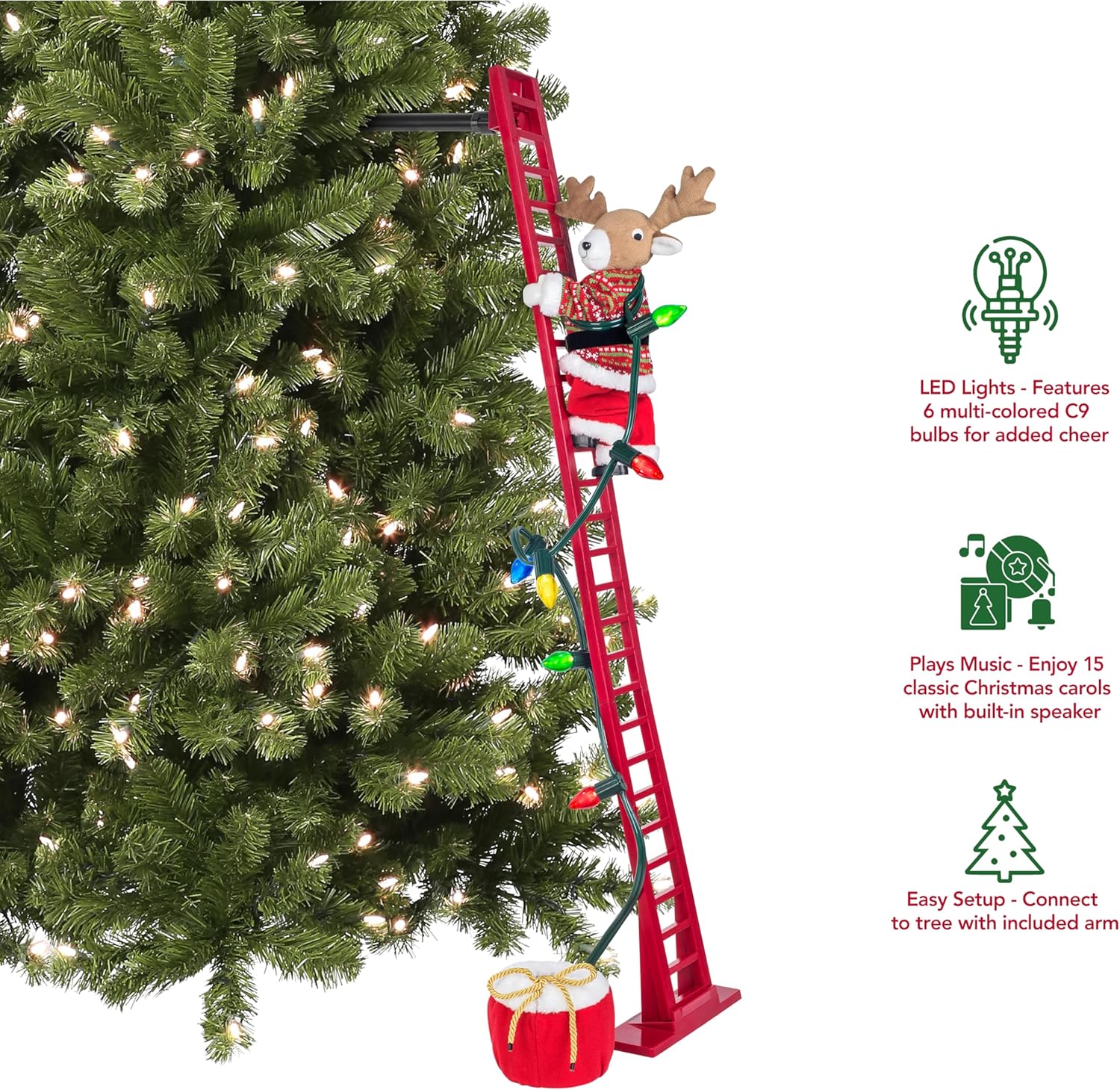 Super Climber from Mr. Christmas is ready to climb into your heart this holiday season. A highly detailed figure in a real fabric outfit climbs up and down a 42" red ladder, never tiring. Simply attach the ladder to your Christmas tree using the included arm and clamp or lean against a wall to easily display. Each Super Climber carries a string of 6 LED lights to decorate with, and as they climb, 15 all-time favorite Christmas carols play. Volume control allows you to enjoy with or without music and included AC adapter power cord with on/off switch keeps the music and the climbing going all day without interruption. Always stepping, never tiring, Super Climber will be a cherished part of your holidays for years to come.