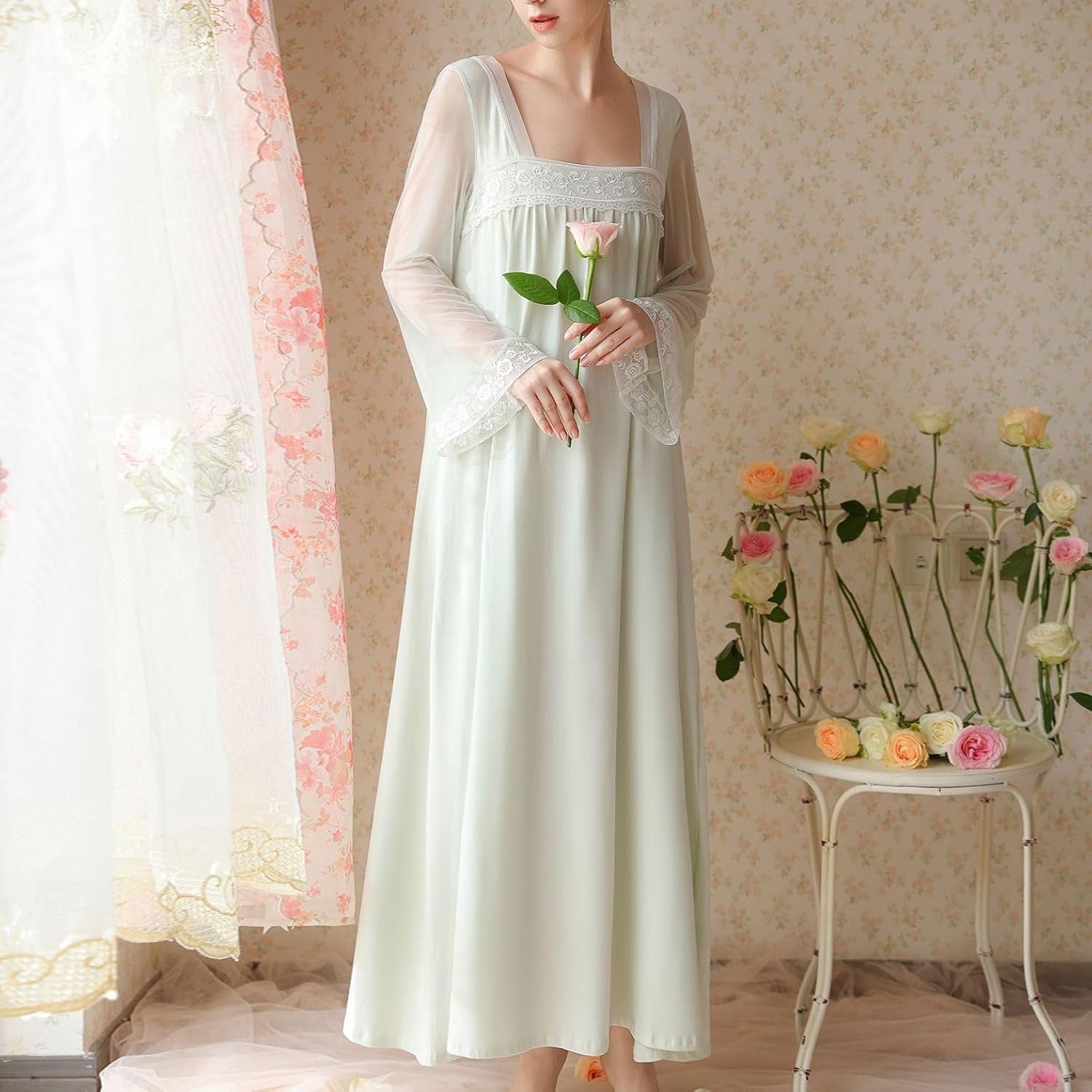 Womens Long Sleeve Nightgown Princess Pjs Long Comfy Summer See Through Spring Loose Loungewear