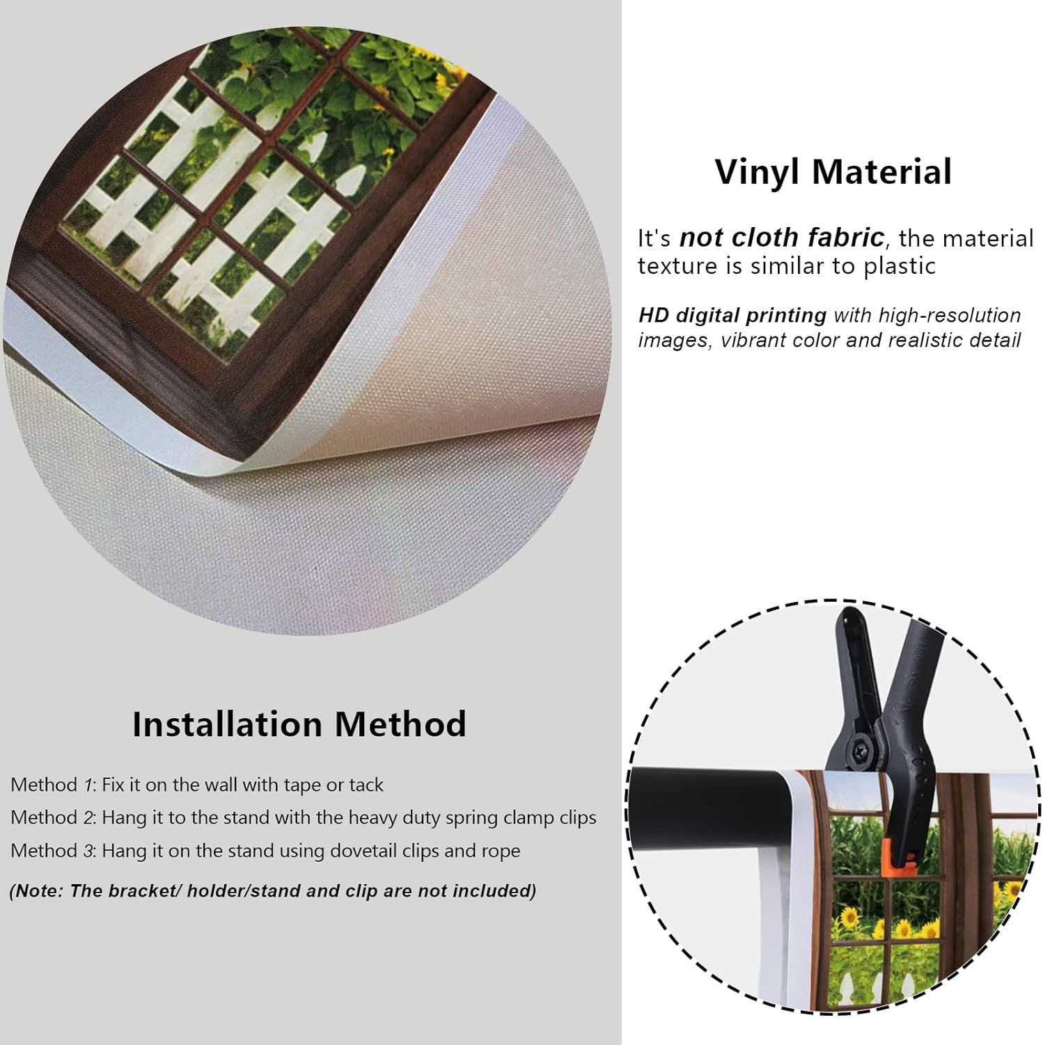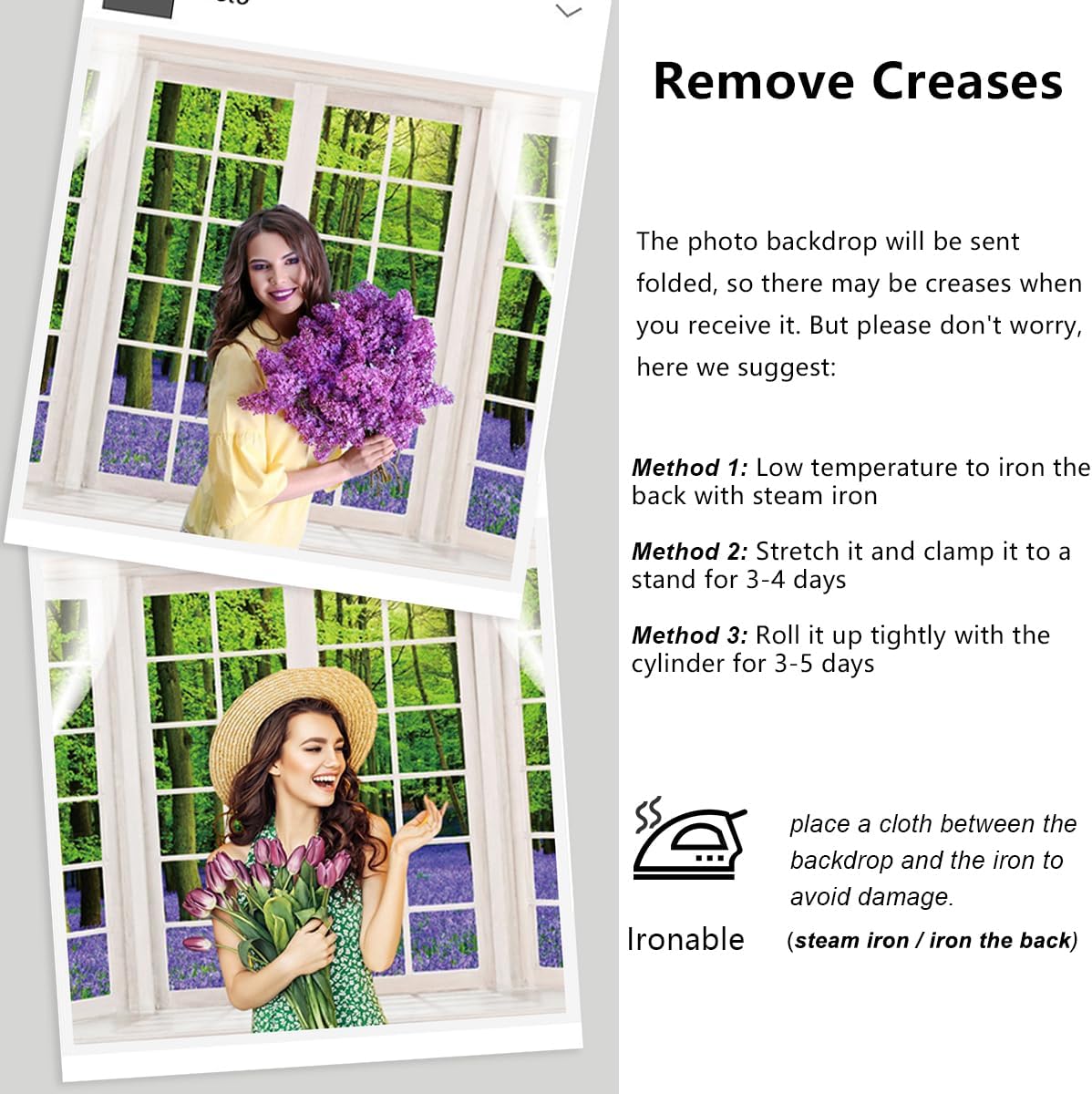 ☀ Warm Tips:(1) Due to the shooting light and monitor brightness, there may be a slight color difference, please understand.(2) To prevent the background cloth from being damaged, please do not wet it directly with water.(3) Prohibit washing and high-temperature heating.(4) Avoid sun exposure and rain to color fading when used outdoors.(5) Please stand the right distance when you take photos. Do not stand too close to avoid causing bad shooting results.(6) Please refer to the size table to choose the size according to your needs.☀ Attention:(1) Please understand that there is a slight error when converting to "feet" because the product is produced according to the unit "meter".(2) Please note It's not cloth fabric, the vinyl material texture is similar to plastic.(3) Without punch rings on backdrop.(4) The stand is not included.☀ Remove Creases:The photo backdrop will be sent folded, so there may be creases when you receive it. But please don't worry, here we suggest:Method 1: Low temperature to iron the back with steam iron Method 2: Stretch it and clamp it to a stand for 3-4 daysMethod 3: Roll it up tightly with the cylinder for 3-5 days☀ Installation Method:Method 1: Fix it on the wall with tape or tack Method 2: Hang it to the stand with the heavy duty spring clamp clipsMethod 3: Hang it on the stand using dovetail clips and rope